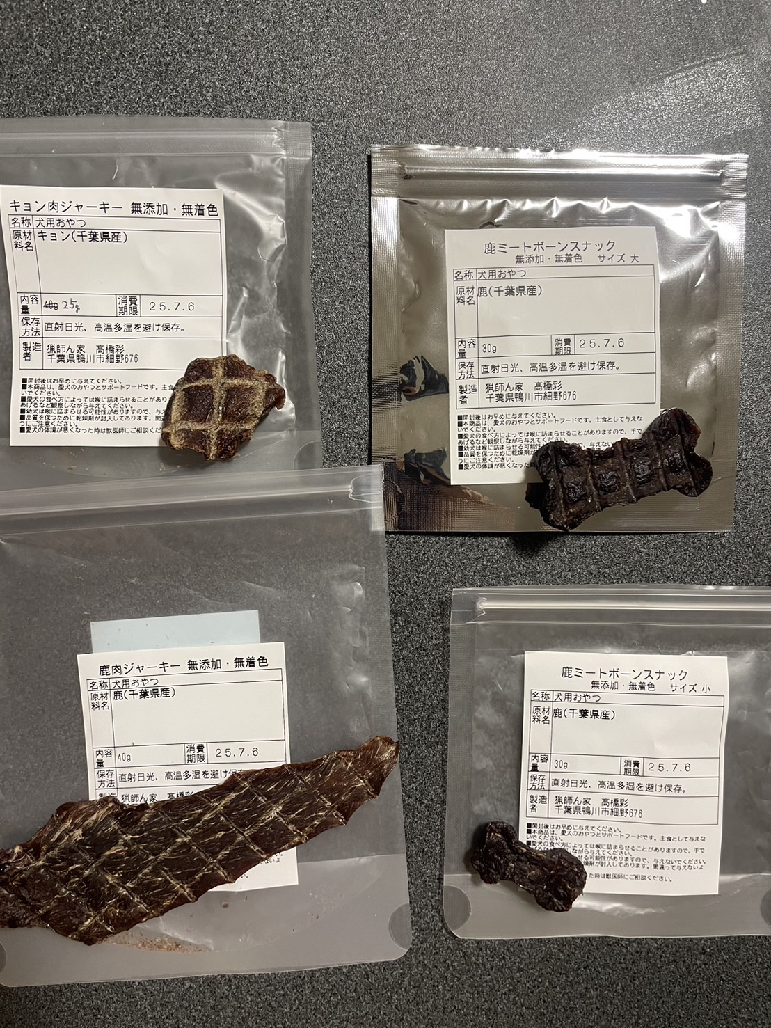 キョン肉ジャーキー珍しいし、鹿ミートボーンスナックは骨の形して可愛いです!