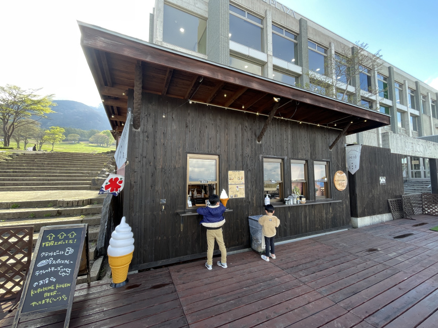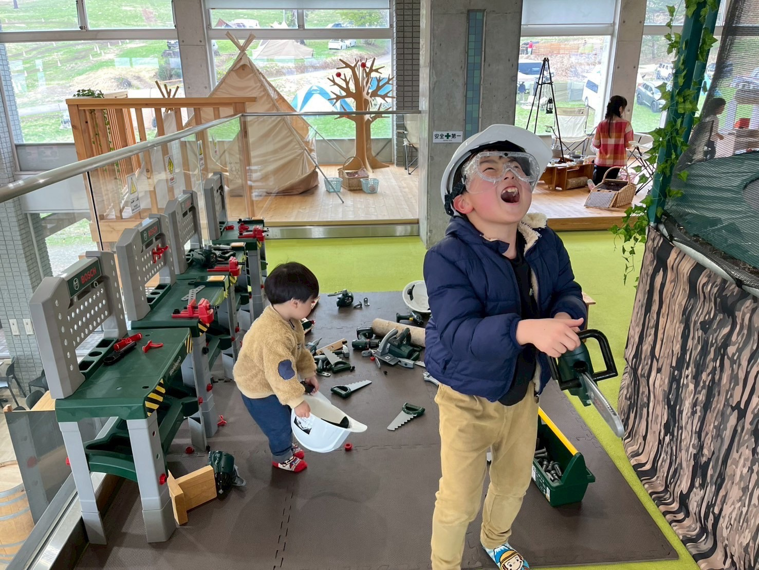 左側の建物に室内遊び場やトイレ、シャワー、受付があります