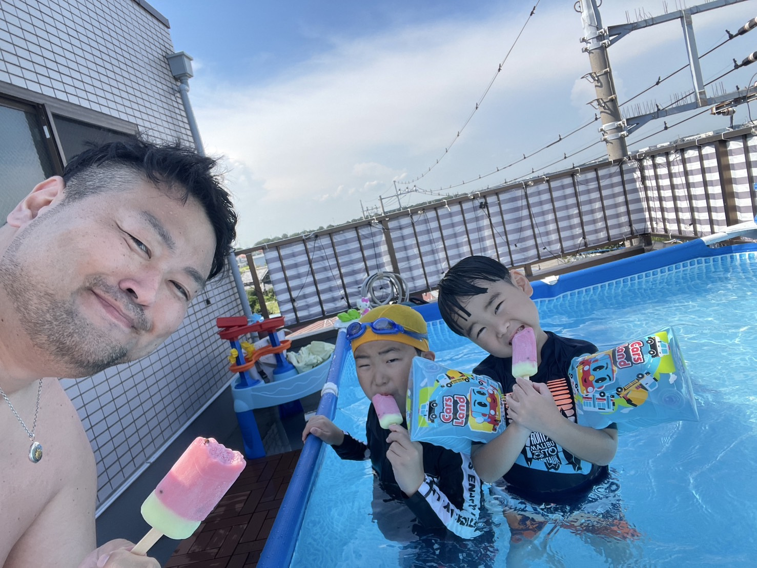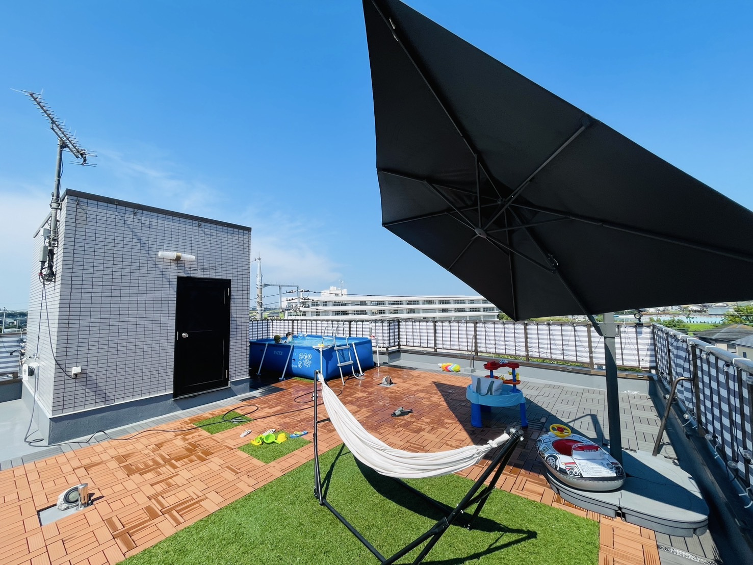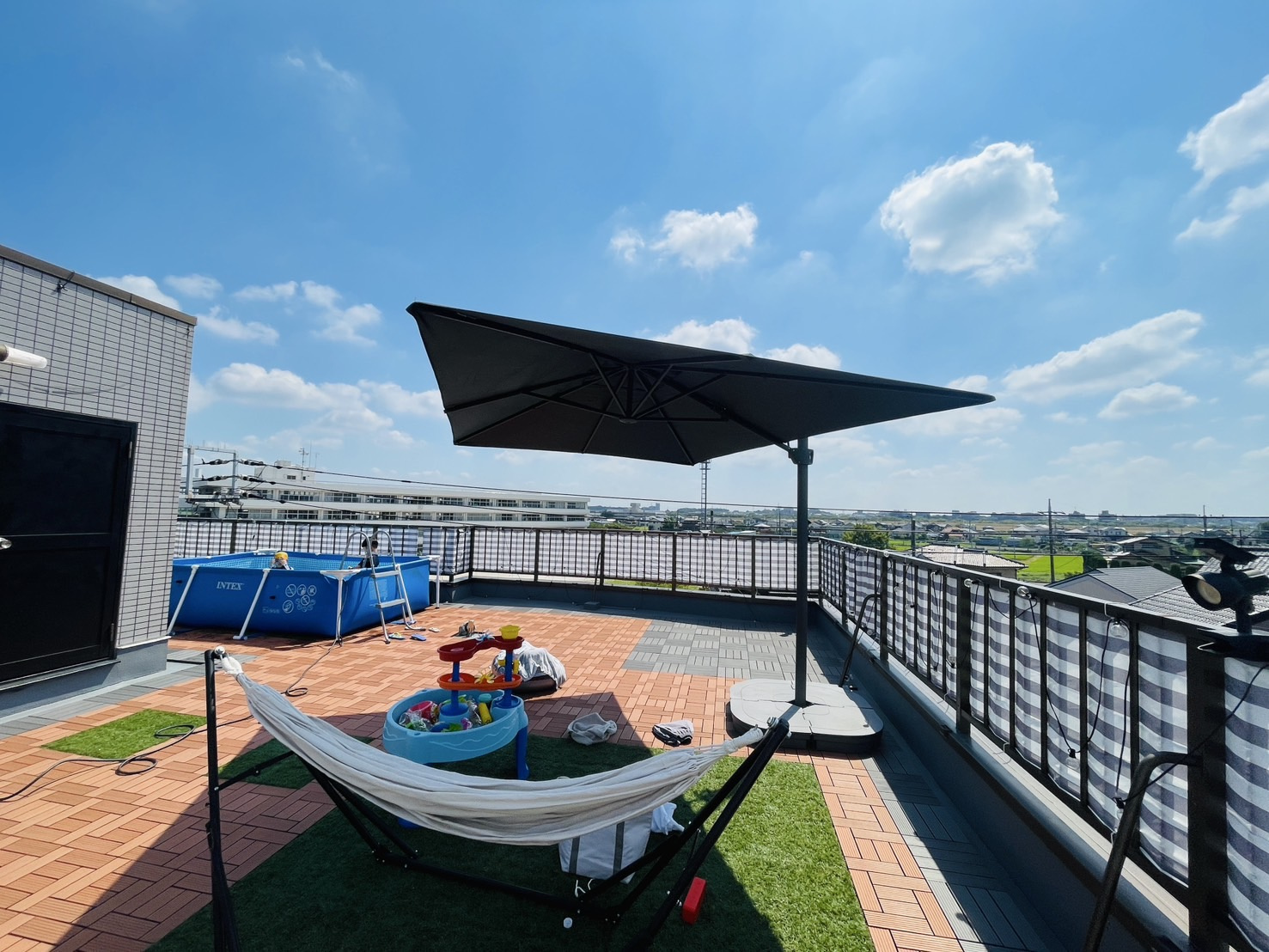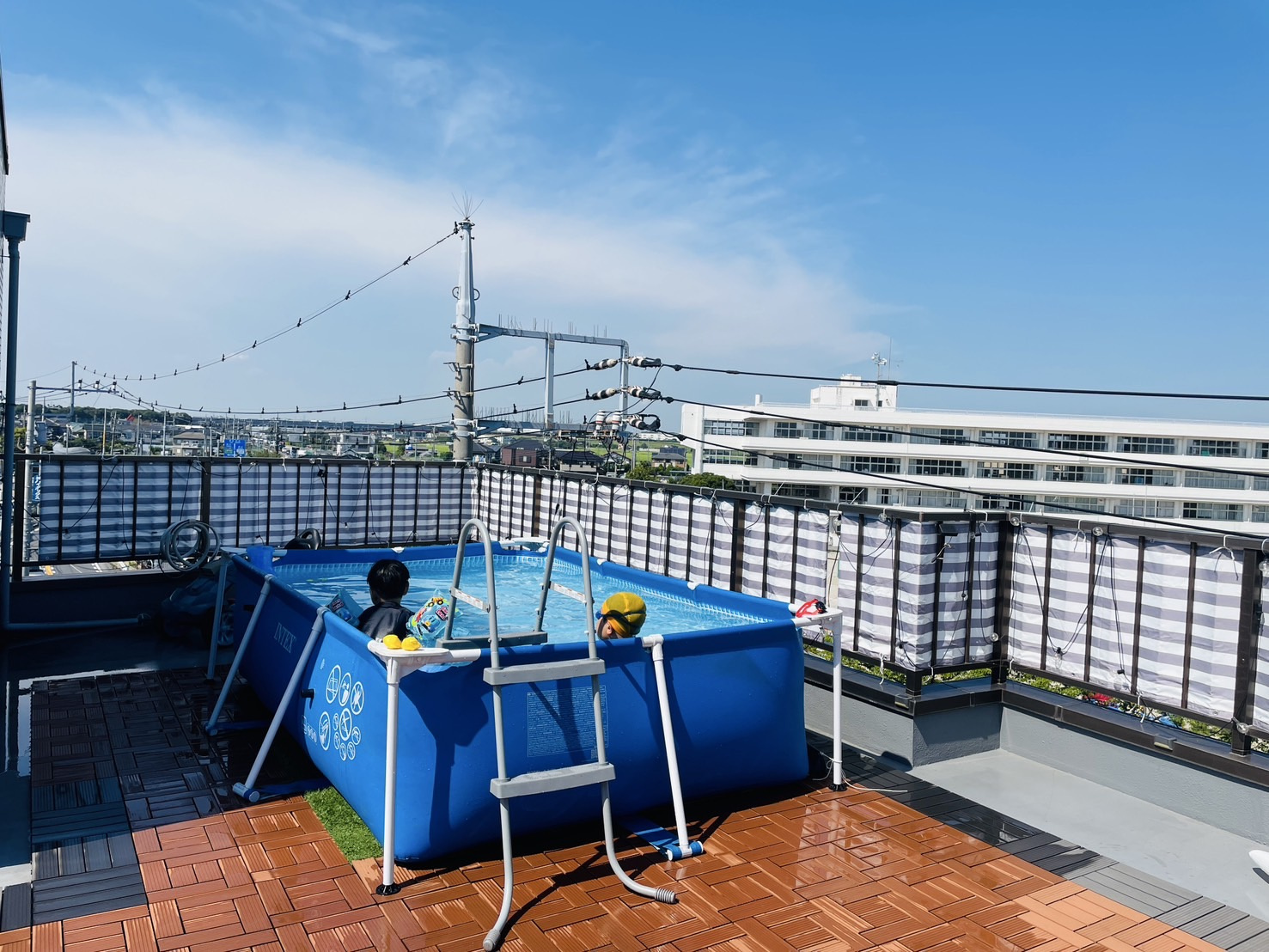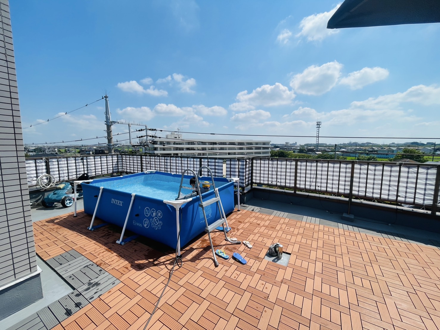 退院後で体力がないので自宅の屋上でプールにしました