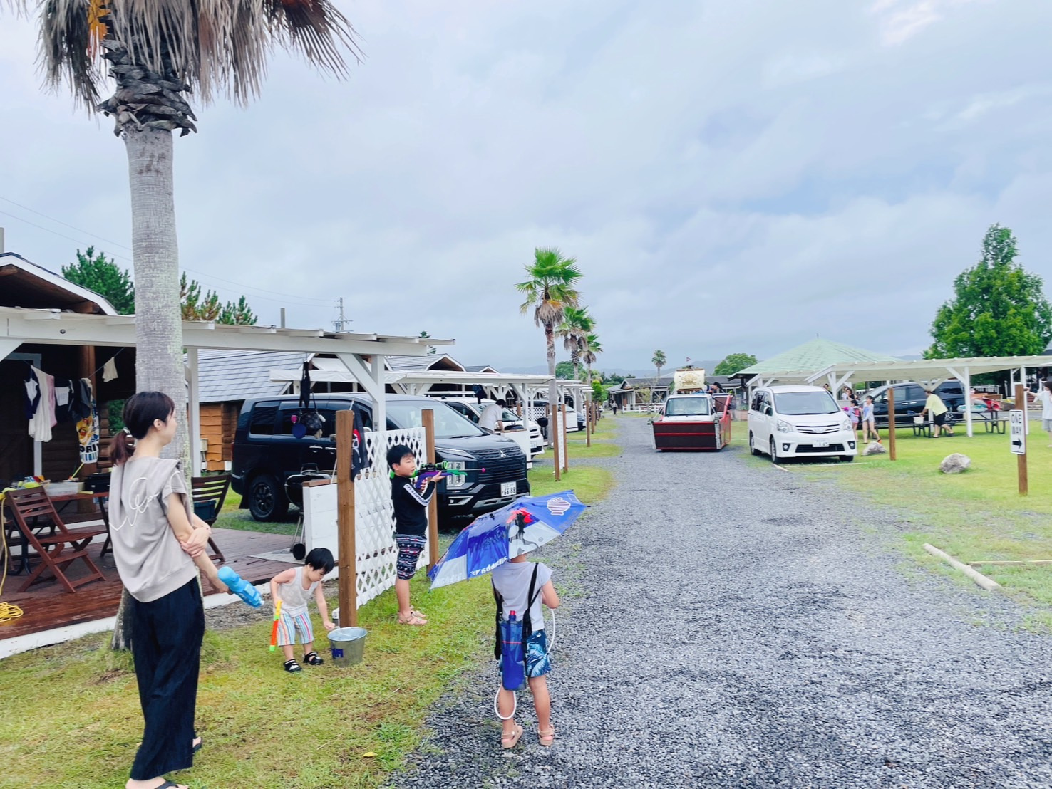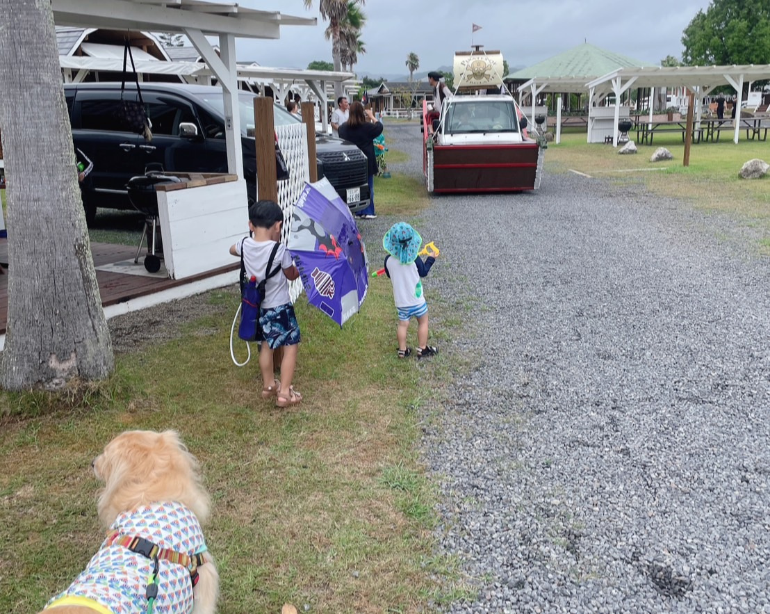 キャンプ場内を海賊船が回ってくるので水鉄砲バトルが始まります!