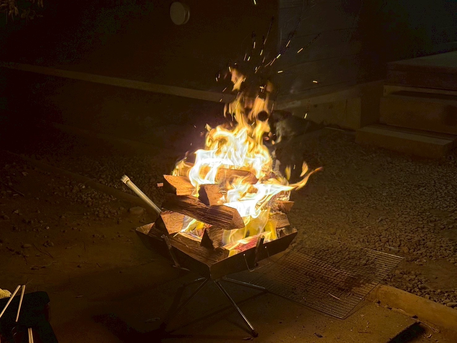 夜は焚火して